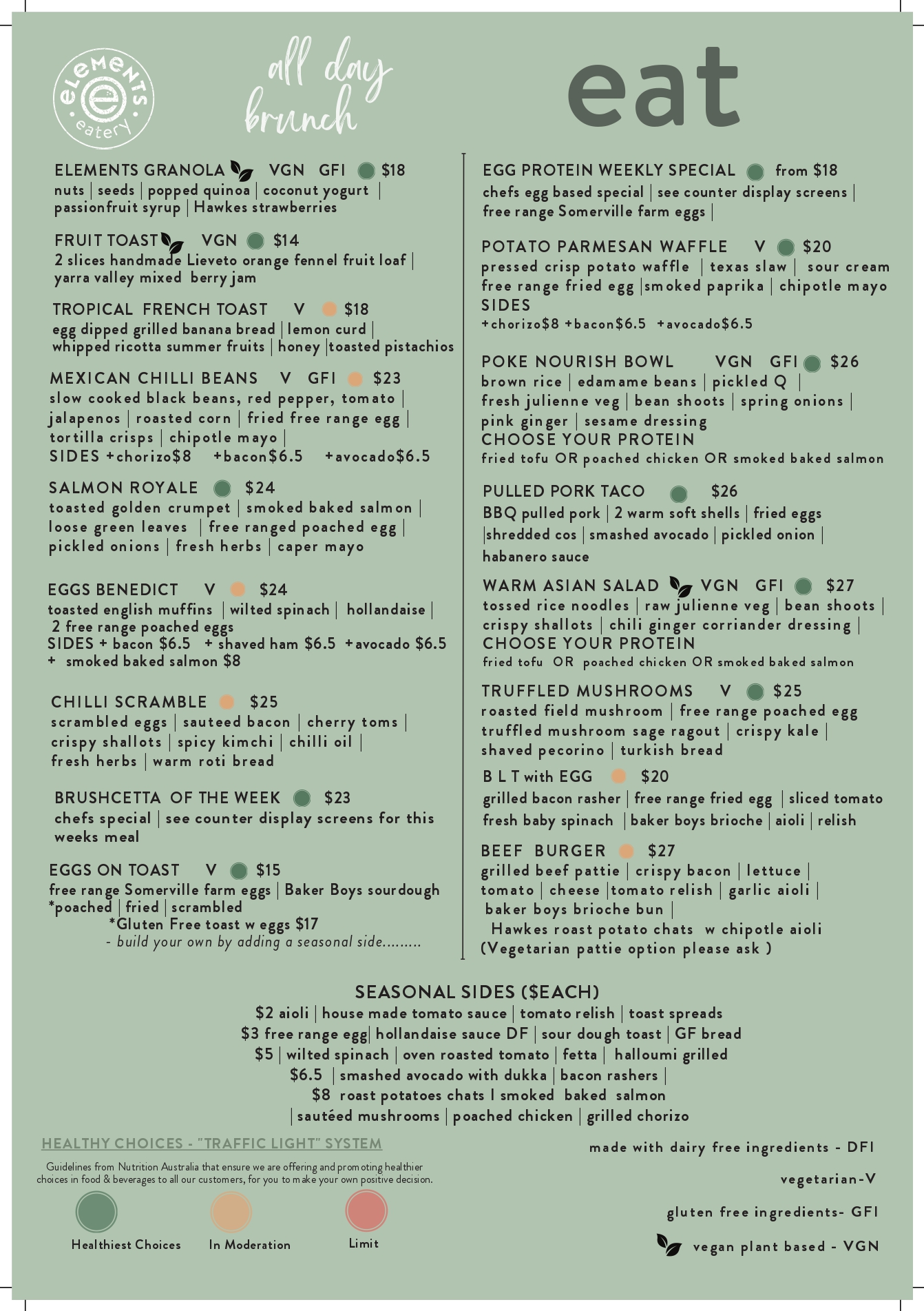 As part of our contractual agreement with the Mornington Peninsula Shire to operate Elements Eatery, we are committed to serving an 80% green focused ‘healthy choices’ menu. This means that we offer locally sourced, fresh and healthy food choices to the community through all our food and beverage offerings. We follow the guidelines set out by the Healthy Eating Advisory Service, fully supported by Peninsula Health.